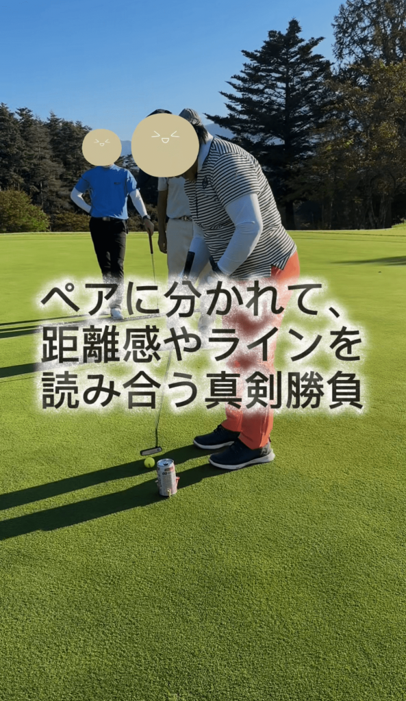 グリーン練習場でペアに分かれて、距離感やラインを読み合う真剣勝負。